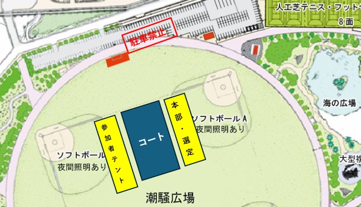 設営図 一般来園者と共有です、必ず周りに迷惑のない駐車をしてください。